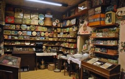 La raccolta nasce dalla paziente ricerca di un collezionista privato e comprende numerosi esemplari di confezioni dell’industria alimentare (biscotti, cioccolato, pasta, caffè) di quando ancora l’eleganza e l’accuratezza del packaging erano affidati a materiali “poveri” come latta o cartone, ma resi preziosi da stampe e decori di pregio, ideati da artisti geniali. Il contenitore, poi, nel riuso creativo diventava spesso un piccolo scrigno personale per foto, lettere, cartoline e bijoux. In queste stanze ritroviamo anche le scatole delle nostre prime chicche e caramelle che ci portano in viaggio a ritroso nello stile di Proust.